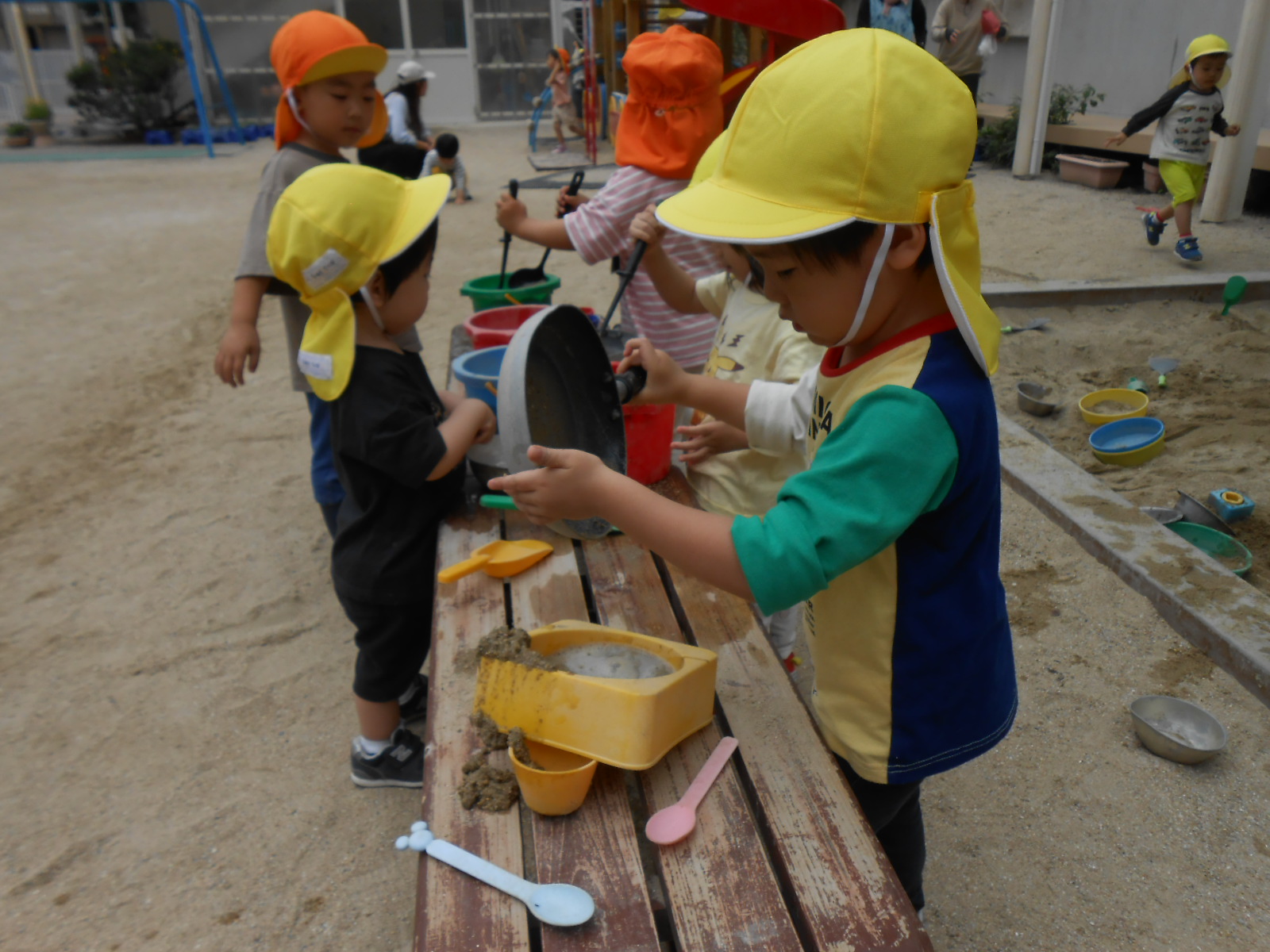 砂場でどろんこ遊びをしました。お水をたくさん使って楽しみました!